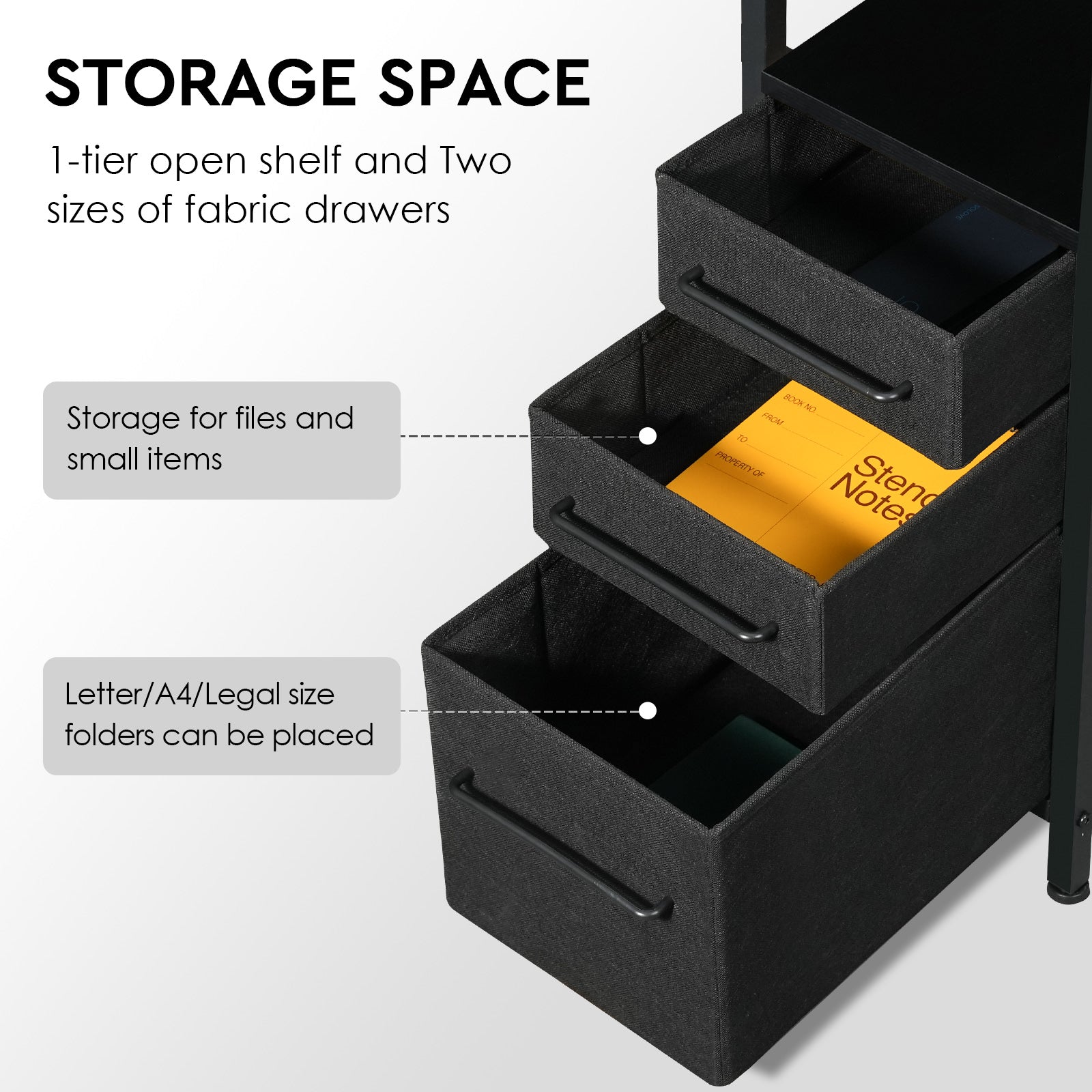 Enhanced Storage Capacity: This compact desk for small spaces boasts three drawers, a side storage pocket, and a 1-tier open shelf, providing ample space for organizing work materials at home or in the office. The bottom drawer conveniently holds A4 file folders, maximizing storage efficiency.