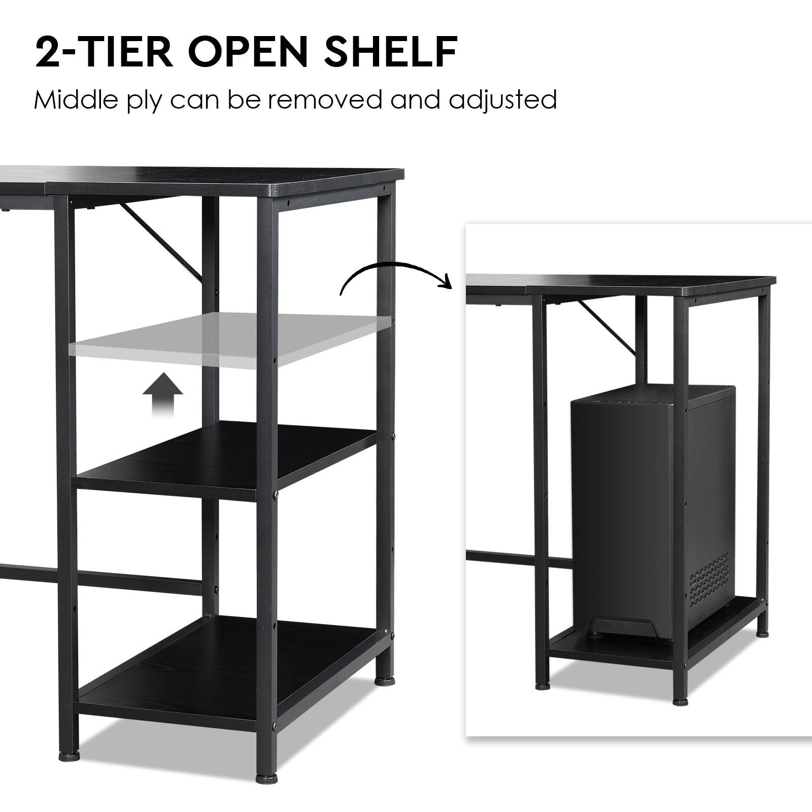 Versatile Storage Design: The left side of the writing desk features two open shelves, providing convenient access to frequently used items. The middle shelf offers dual height adjustments, accommodating a range of computer tower sizes.